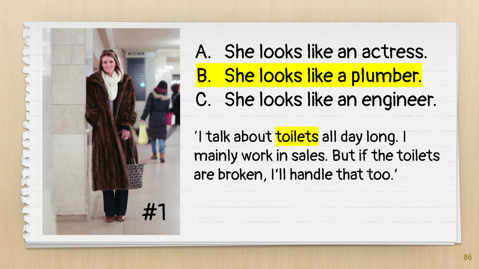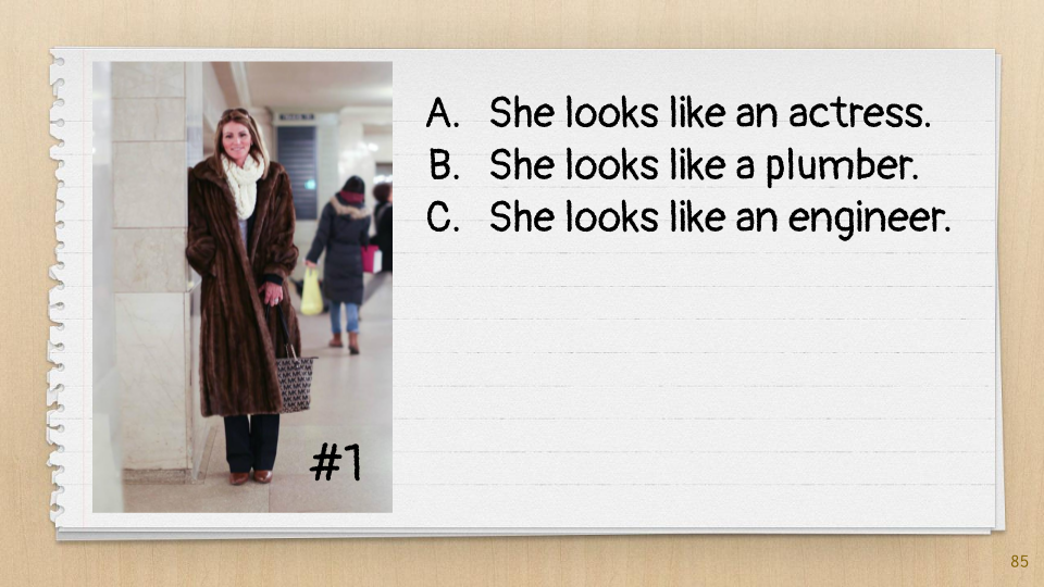 Elementary school students have a strong sense of justice and are beginning to form concepts about people based on their appearance. While studying the “[S]he looks like” sentence structure, we challenged their stereotypes with a multiple choice test.
