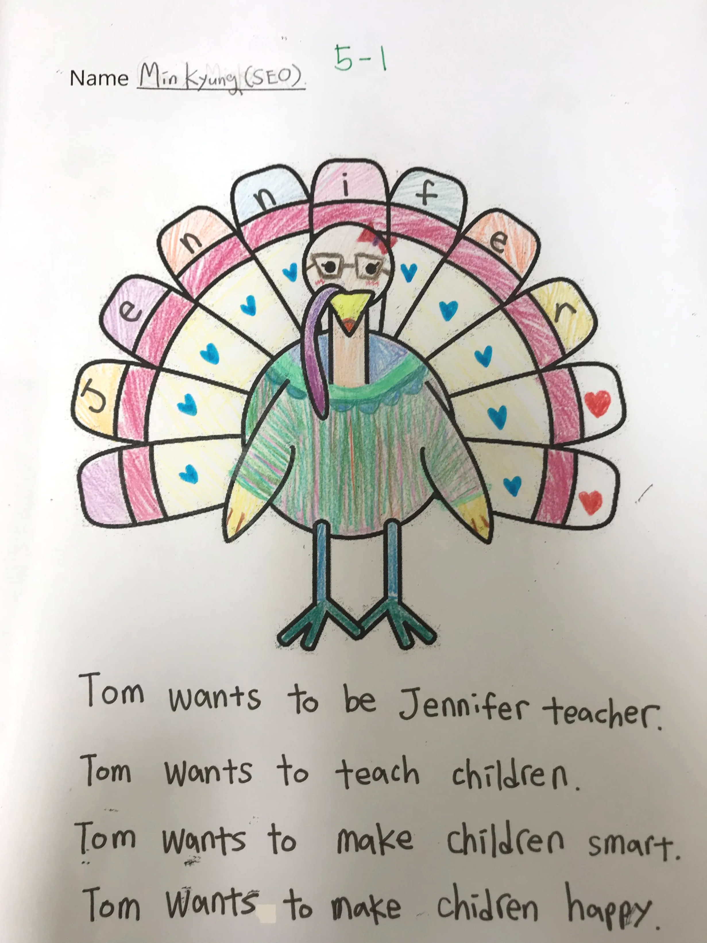 During Thanksgiving, I asked students to draw a disguise for Tom the Turkey so he could escape being eaten. One student disguised him as me!